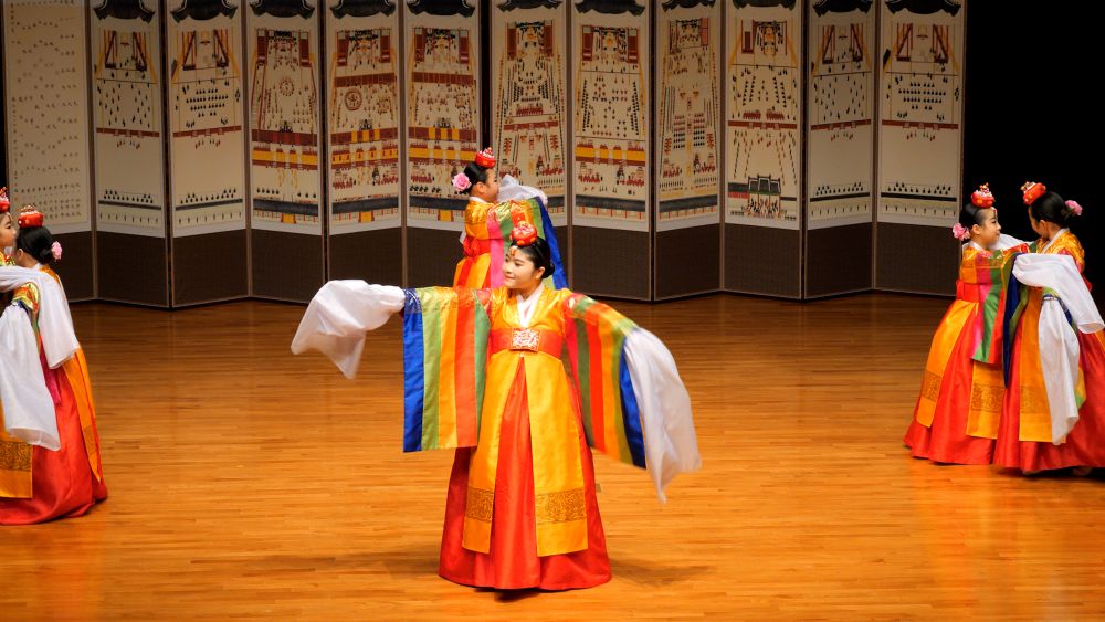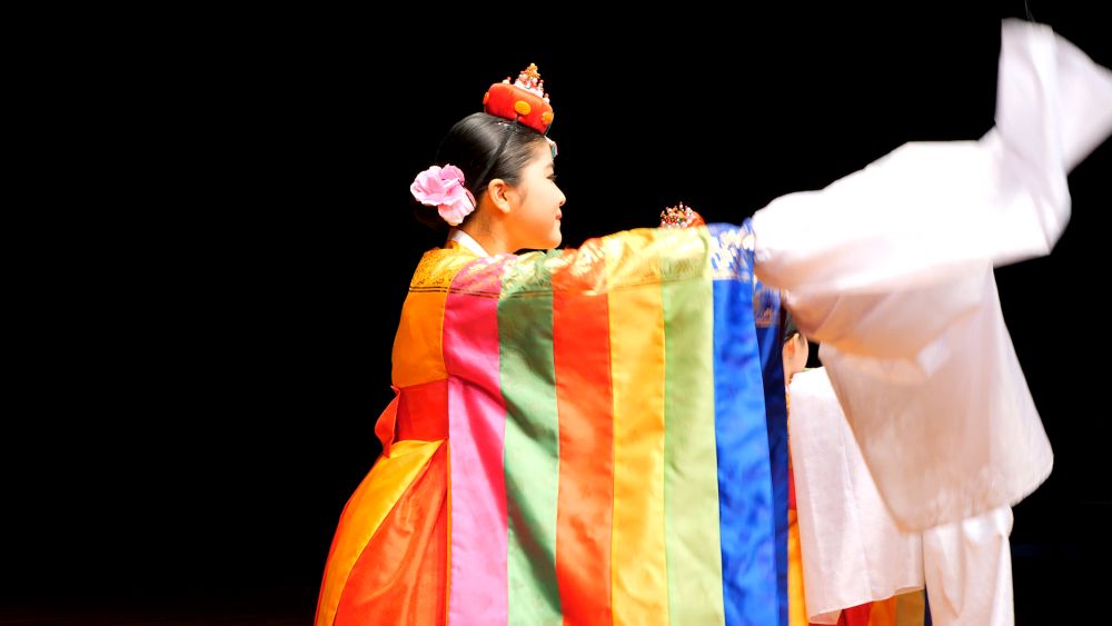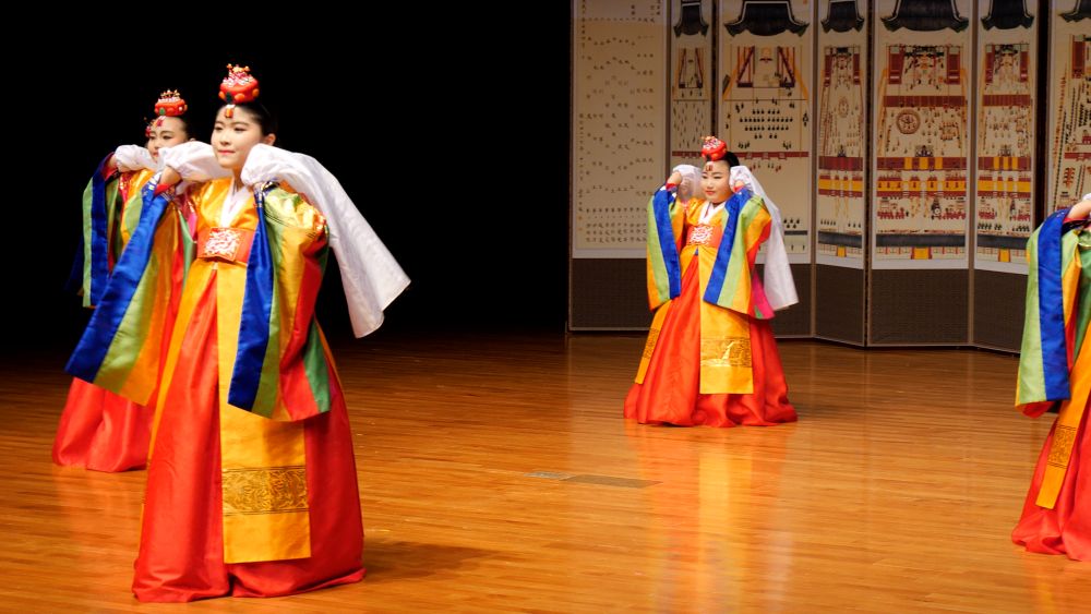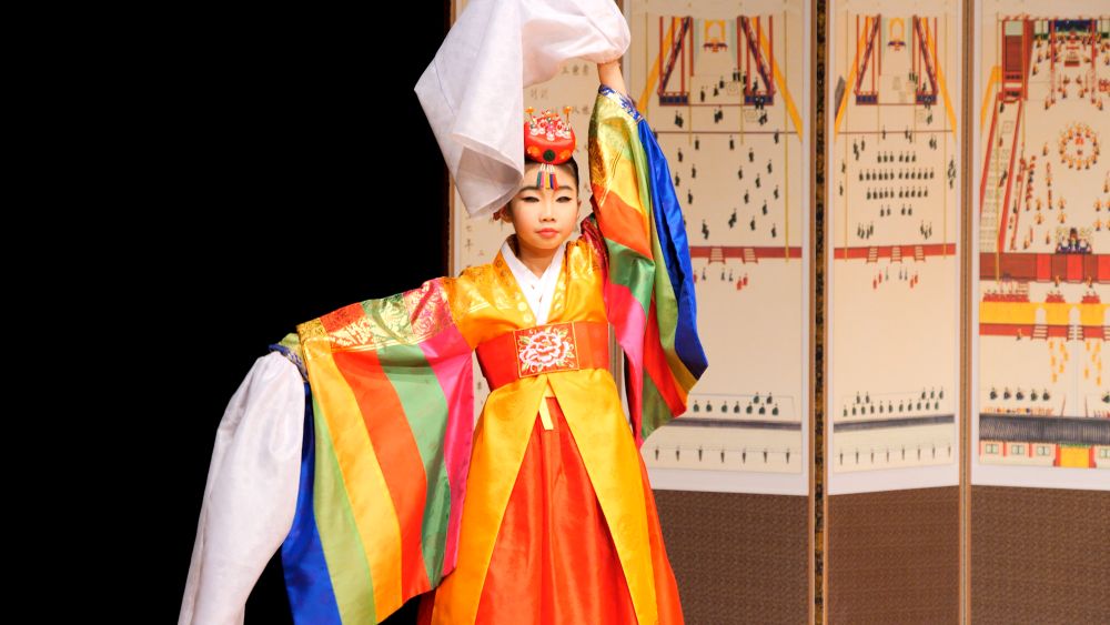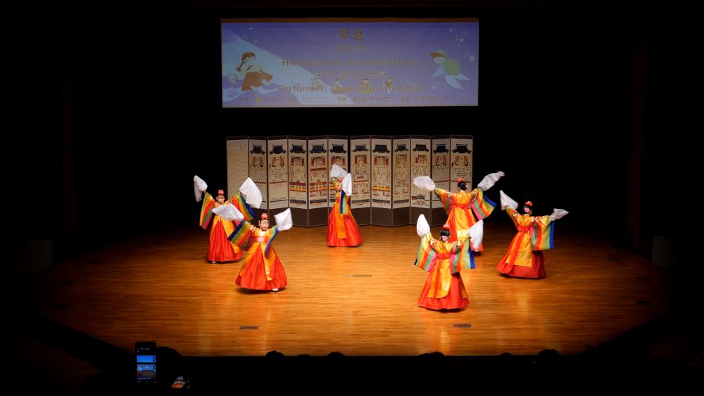 궁중무 복식에 화관을 쓰고 타령조에 맞춰 한삼을 뿌리거나 감아들이며 추는 화관무는 궁중풍의 우아함과 화사함이 돋보이는 춤으로 한국춤의 정 중 동과 동 중 정의 미학을 담은 작품이다.