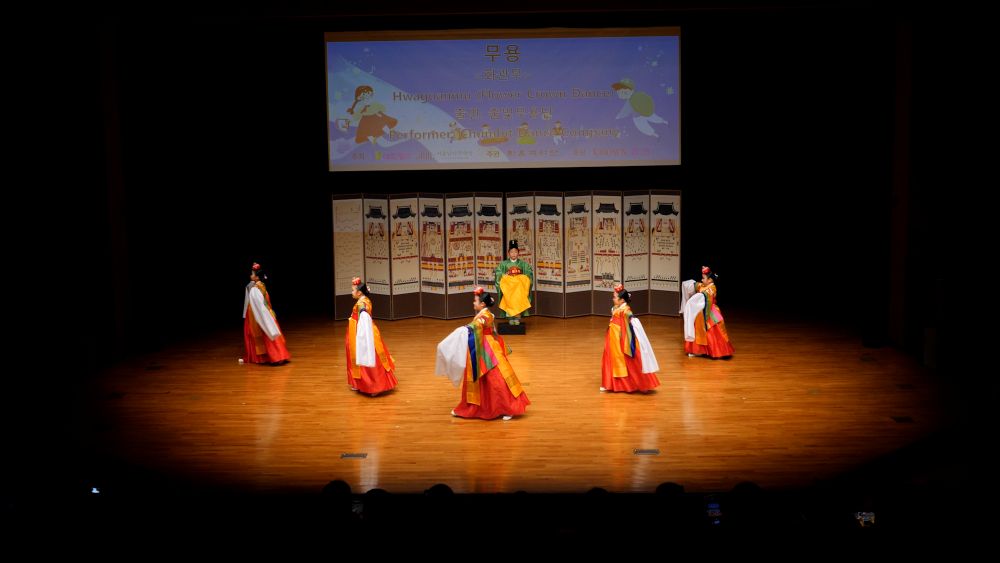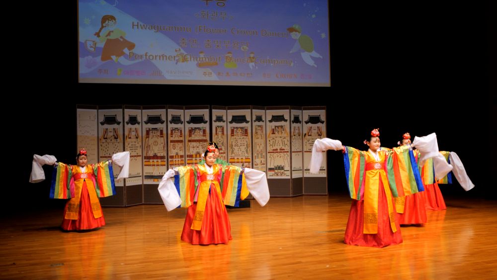 궁중 복식에 화관을 쓰고 타령조에 맞춰 한삼을 뿌리거나 감아들이며 추는 화관무는 궁중풍의 우아함과 화사함이 돋보이는 신무용계열의 창작춤으로 한국춤의 정 중 동과 동 중 정의 미학을 담은 작품이다.